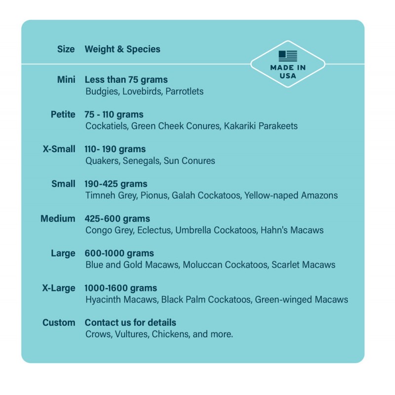 Small: 190-425 grs. Pionus, pequeñas cacatúas, pequeños amazonas…