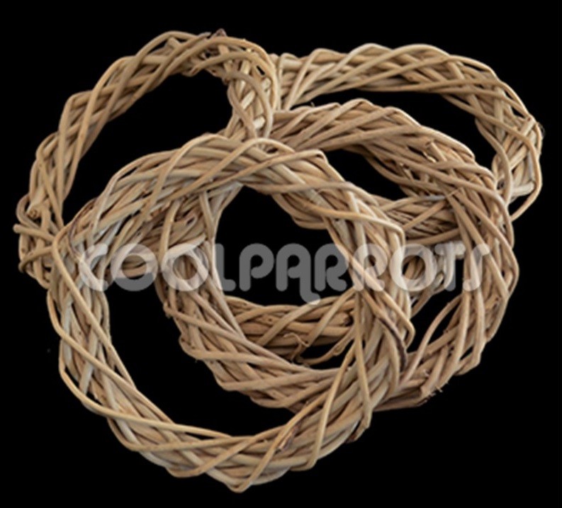 Esta pieza realizada en ramitas de parra es ideal para añadir a nuestros juguetes colgándola de cualquier tipo de cuerda o cadena, o para hacer divertidos columpios comestibles para aves de pequeño tamaño.