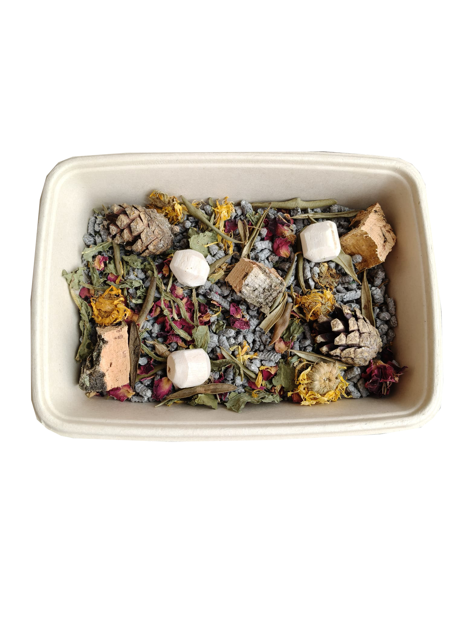 Esta bandeja de forrajeo fabricada en caña de azúcar, lleva un fondo de pellets de papel prensado sobre el que encontramos hojas de diente de león y olivo, pétalos de caléndula y rosa, piezas de corcho, piñas y bolitas de raíz de yuca.