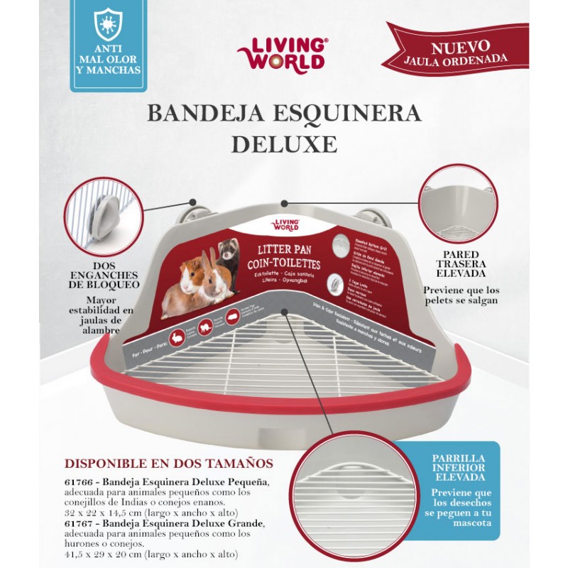 Fabricada en material resistente a manchas y olores, dispone de rejilla para mantener limpias sus patas y evitar que esparzan los desechos por toda su jaula o recinto.