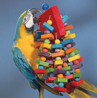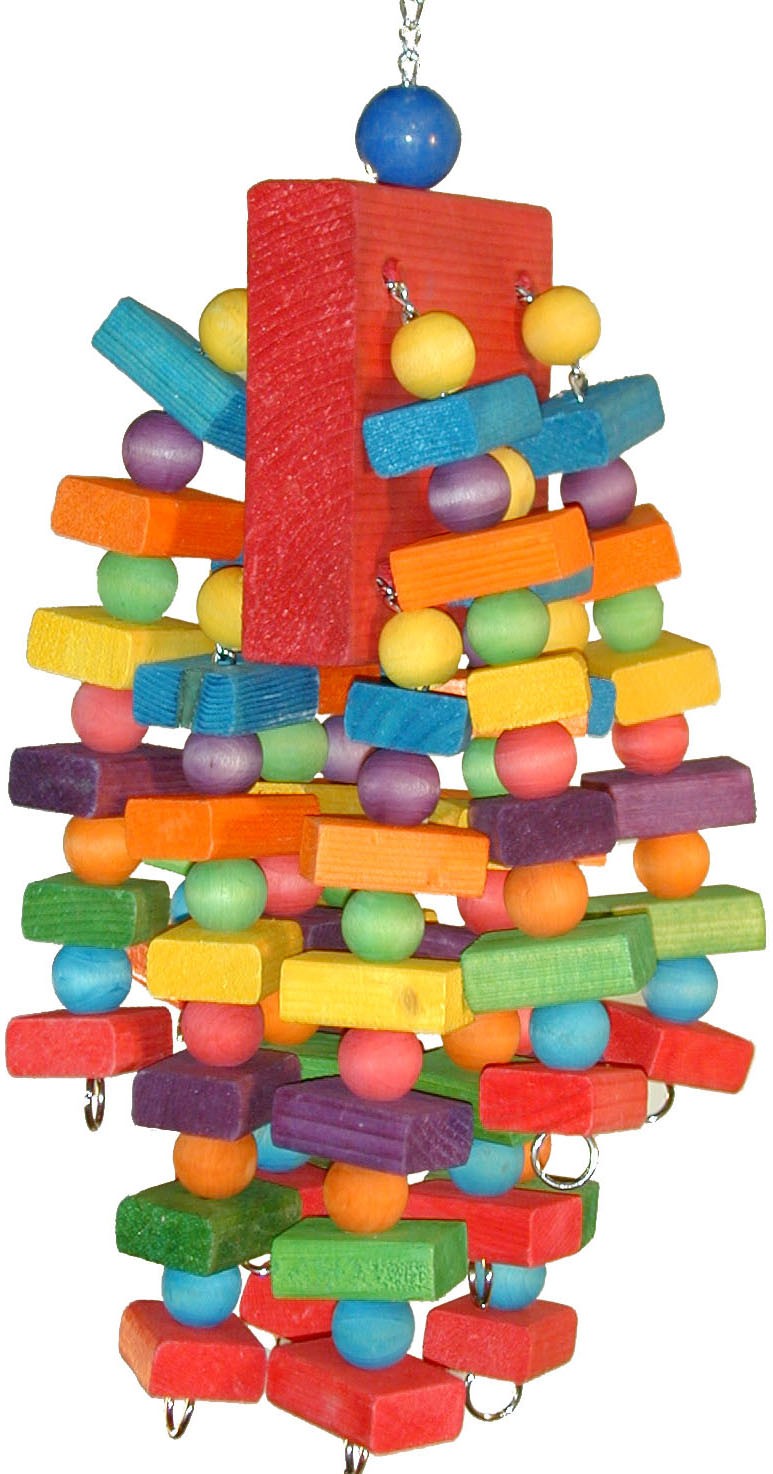 Un gran bloque de madera es la base de este juguete ideal para los loros más destructores, de ella cuelgan 8 cadenas repletas de tacos y bolas coloreadas. Horas de entretenimiento para yacos, cacatúas, guacamayos, etc.