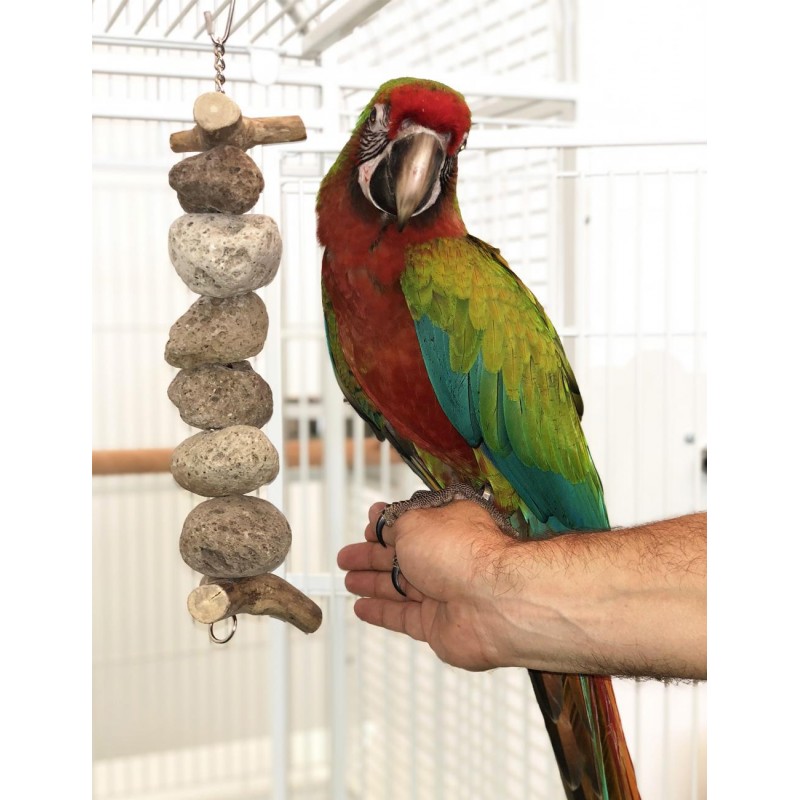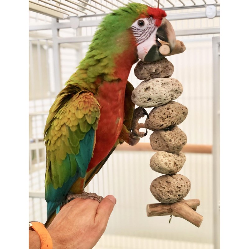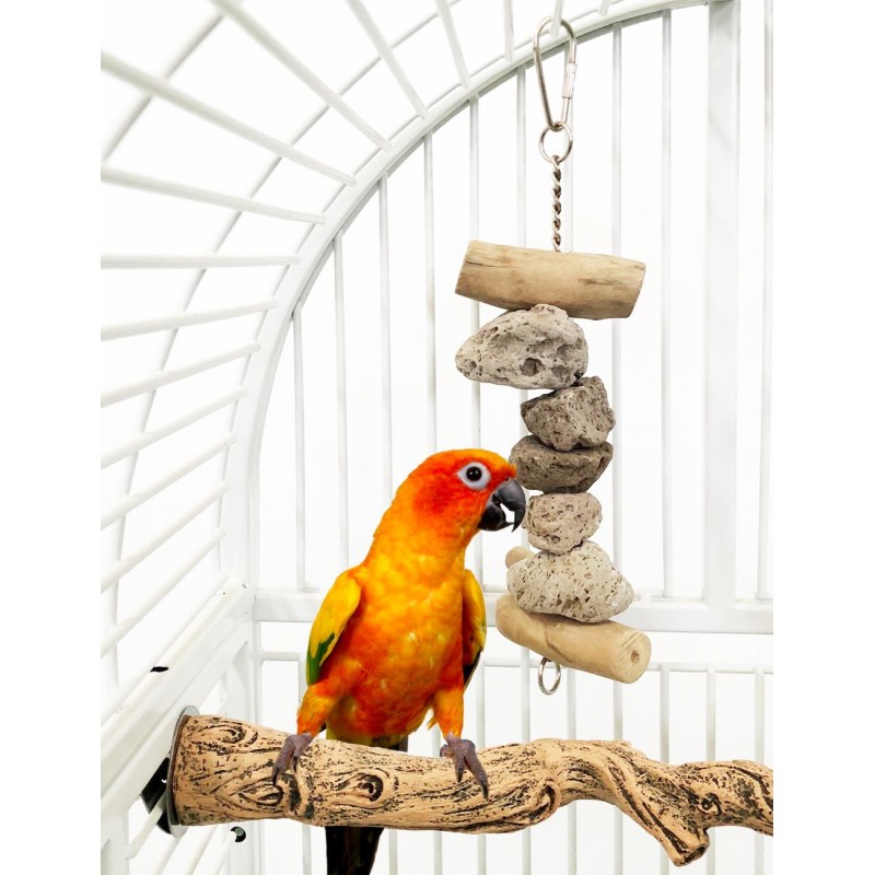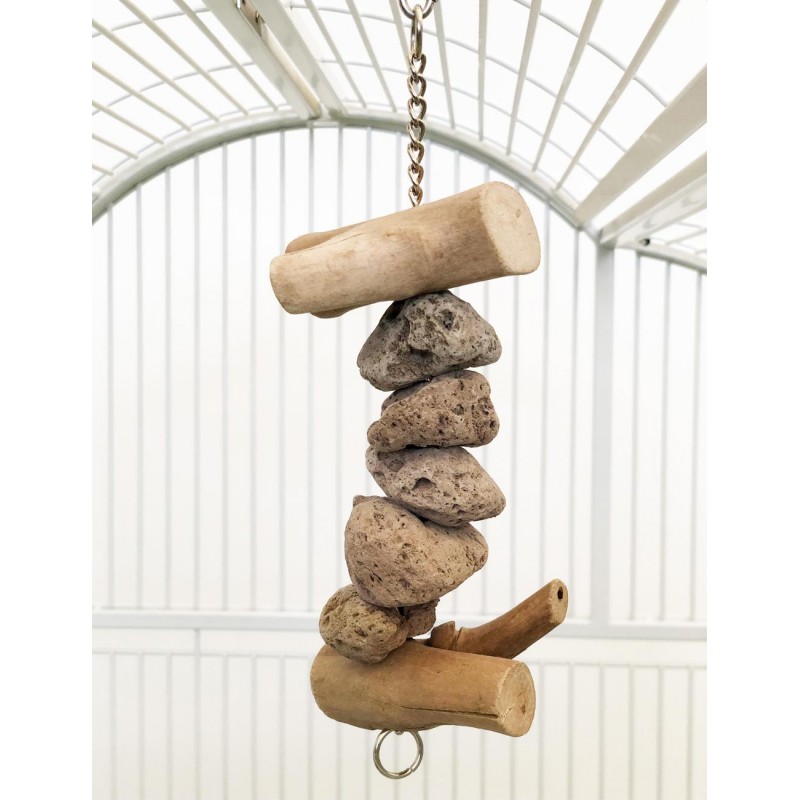 Resistente juguete para loros de tamaño mediano y grande compuesto por varias rocas volcánicas y dos piezas de madera Java.