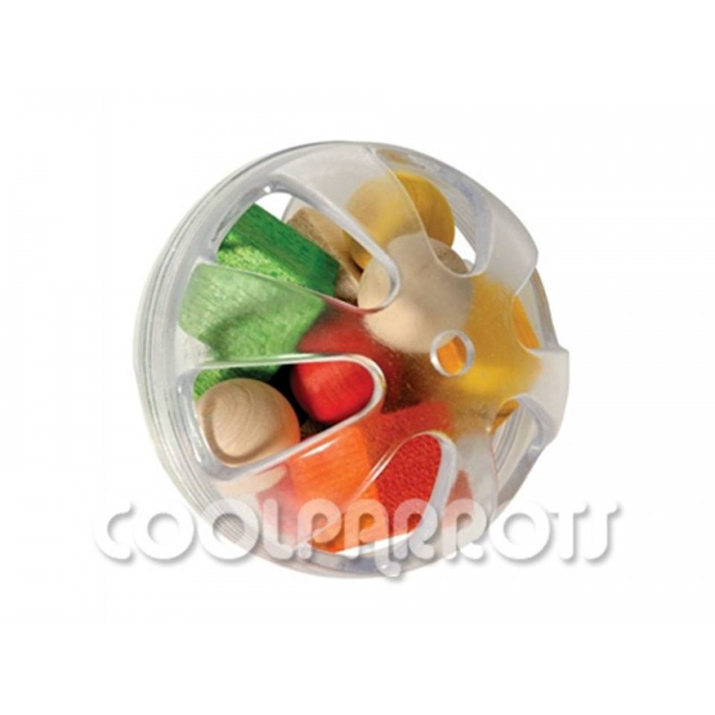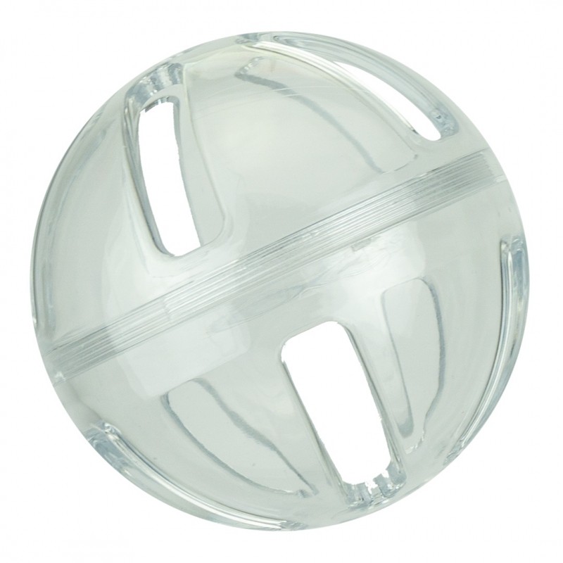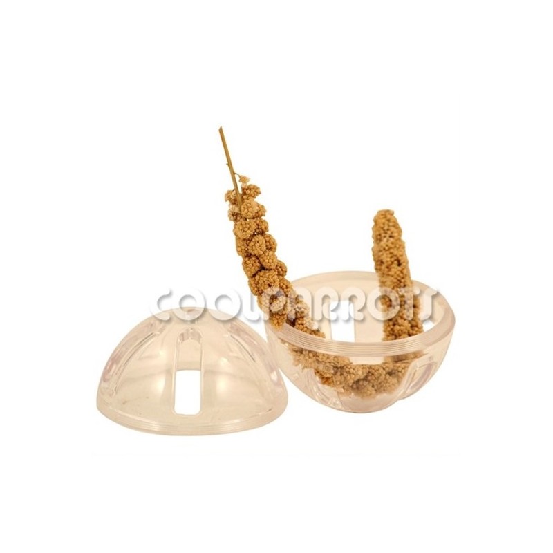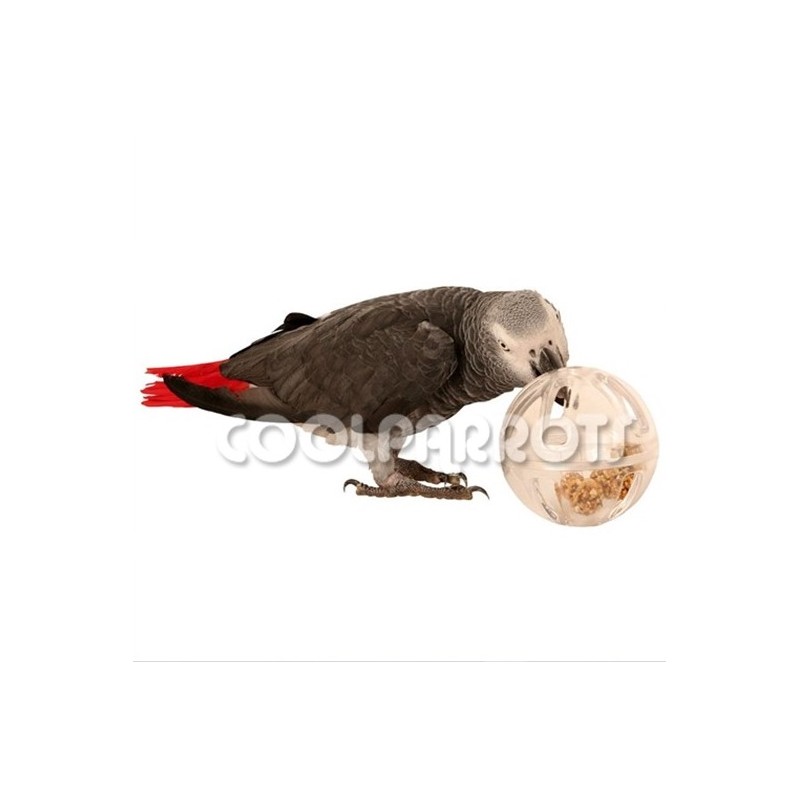 Se trata de una bola de policarbonato en el interior de la cual podremos colocar fruta/verdura, snacks, pienso, o pequeñas piezas de madera.