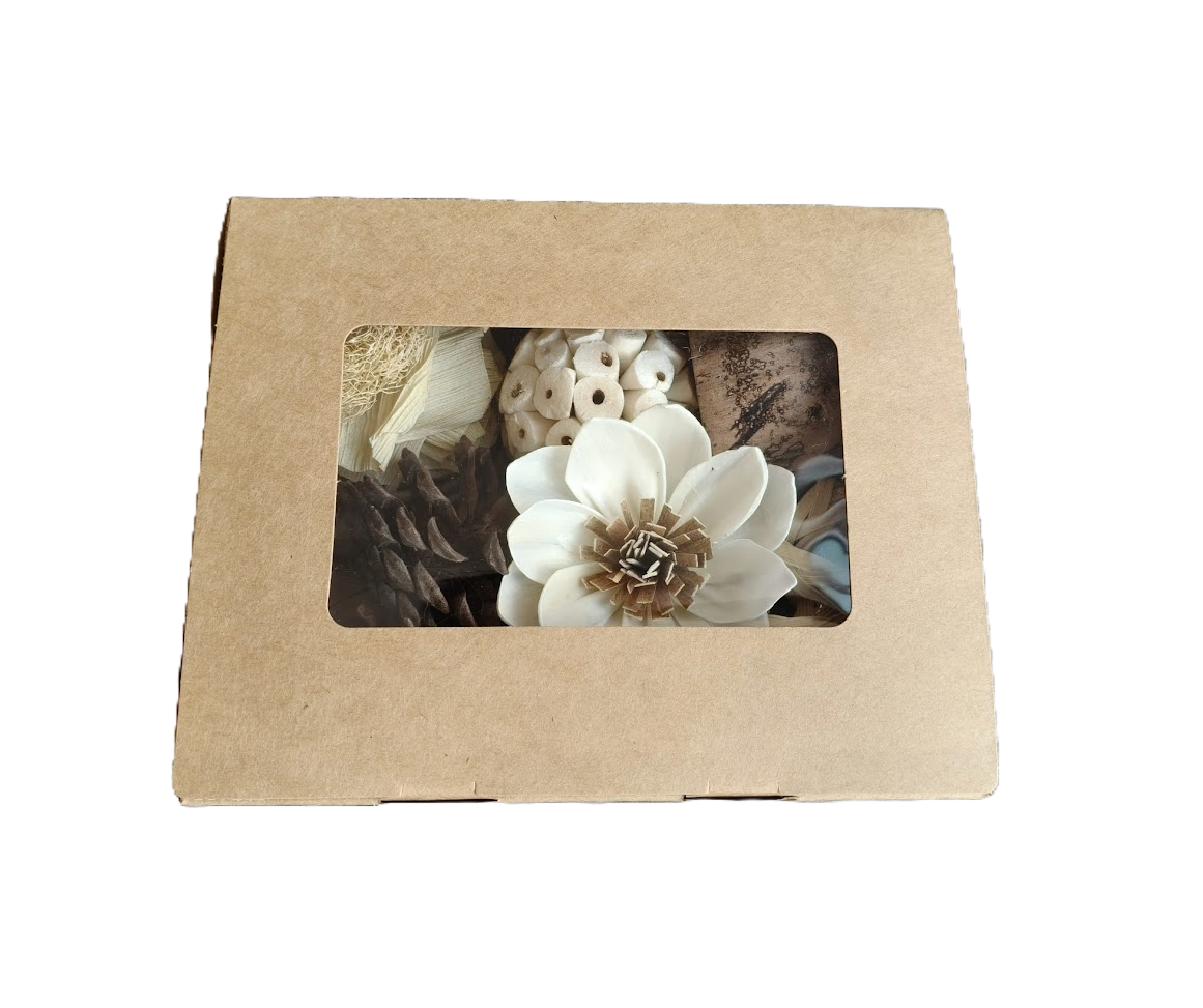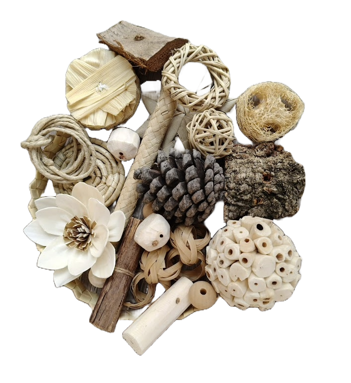 Esta caja contiene multitud de piezas 100% naturales para hacer juguetes a nuestros loros o recomponer viejos juguetes.