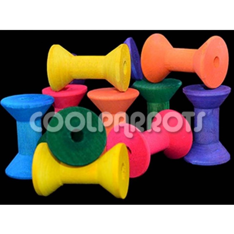 Original pieza de madera en forma de carrete y en diferentes colores. Son ideales para aves de tamaño pequeño/medio.