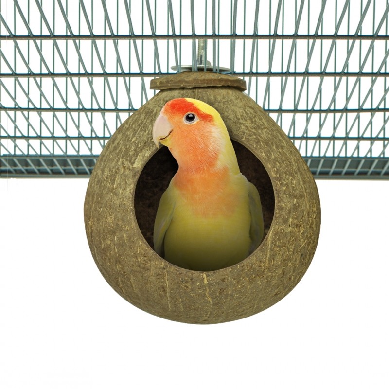 Esta casita fabricada en cáscara de coco 100% natural es el refugio ideal para pequeños loritos como agapornis, forpus, periquitos o canarios.