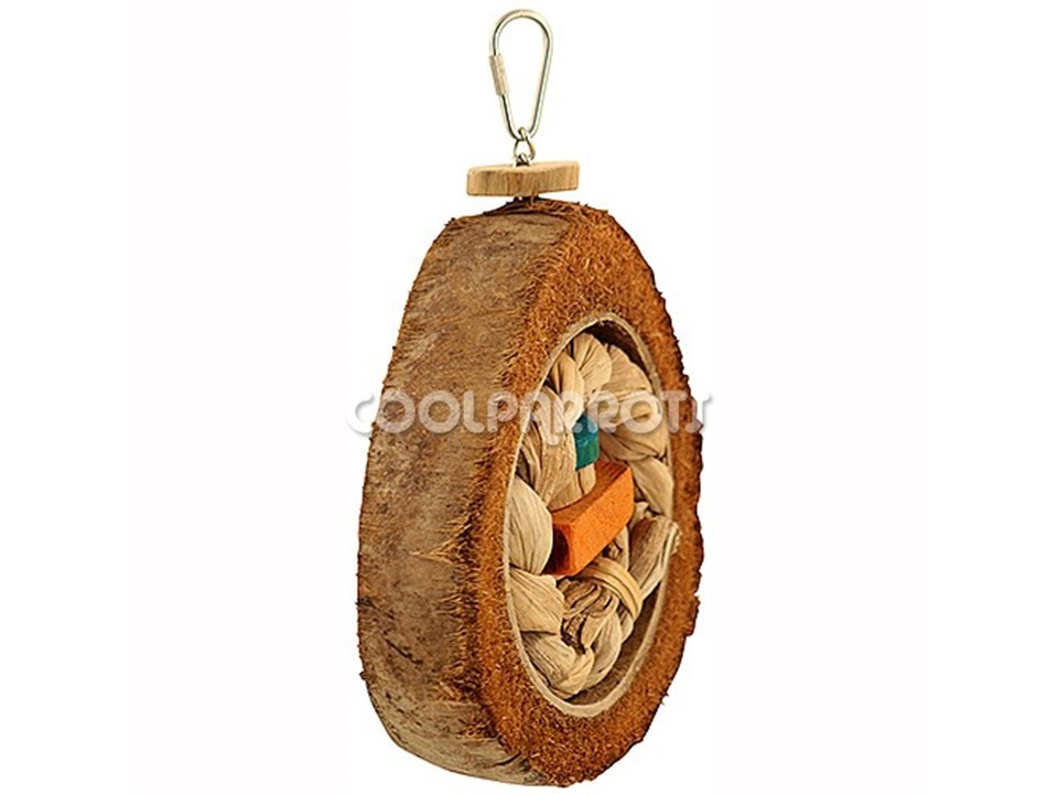 Anilla de corteza de coco sin pelar, lo que proporciona miles de fibras naturales que picotear. Además lleva en su interior un aro de hierba marina trenzada y algunas piezas de madera natural.