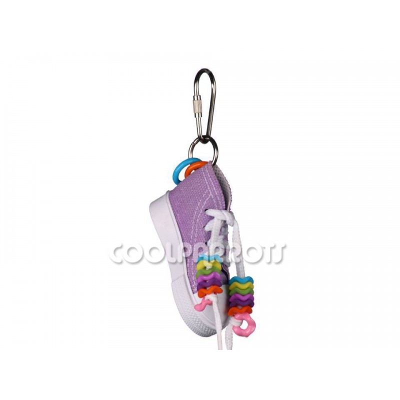Zapatilla tipo Converse de cuyos cordones cuelgan varias arandelas de plástico de llamativos colores.