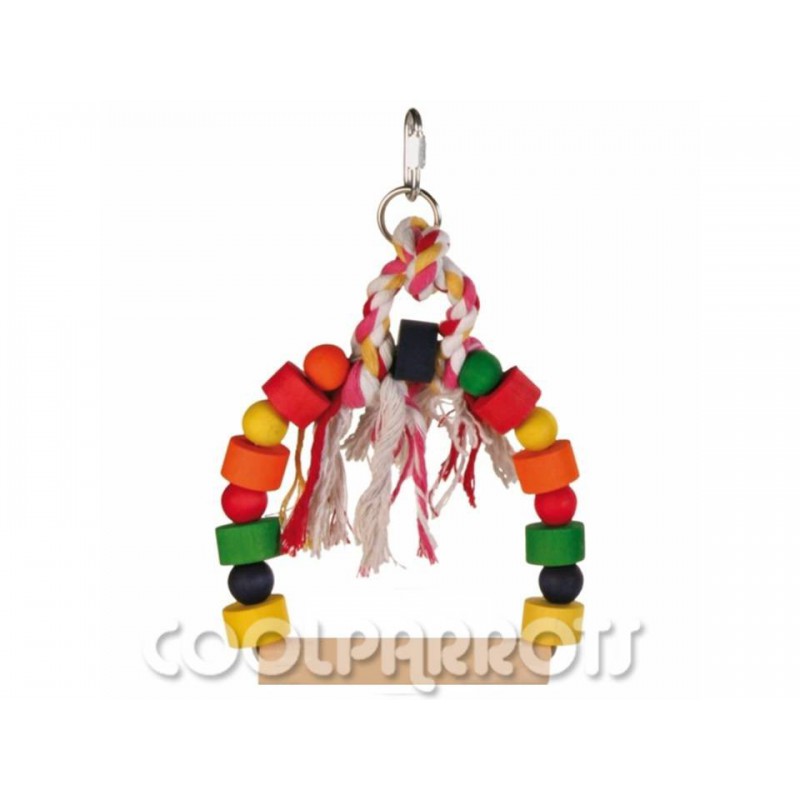Divertido columpio realizado en taquitos de madera de diferentes y llamativos colores que dispone además, en su parte superior, de una cuerda ideal para deshilachar mientras se balancean en el.