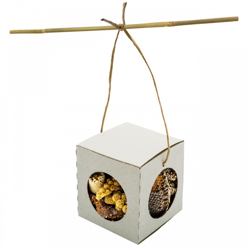 Entretenido cubo de cartón relleno de diversas variedades de mijo y cabezas de girasol.