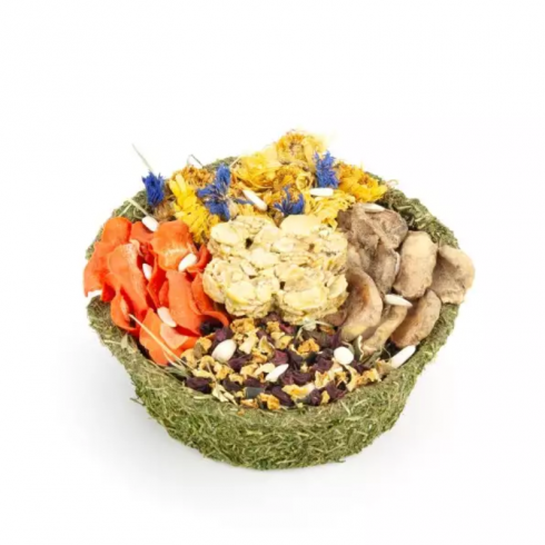 - Composición: Cuenco de fibra natural, copos de guisantes, heno de festuca, rodajas de zanahoria, chips de alcachofa, perejil, calabacín, remolacha, subproductos vegetales, caléndula, aciano.