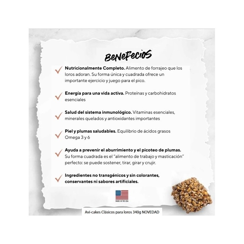 Guía de alimentación: Ofrece Avi-Cakes frescos a diario, junto con agua limpia y fresca. Suministra la cantidad que creas que tu ave comerá en un plazo de 12 horas. Se recomienda complementar la dieta con hasta un 20% de frutas y verduras frescas. También puede ofrecerse como premio o golosina.