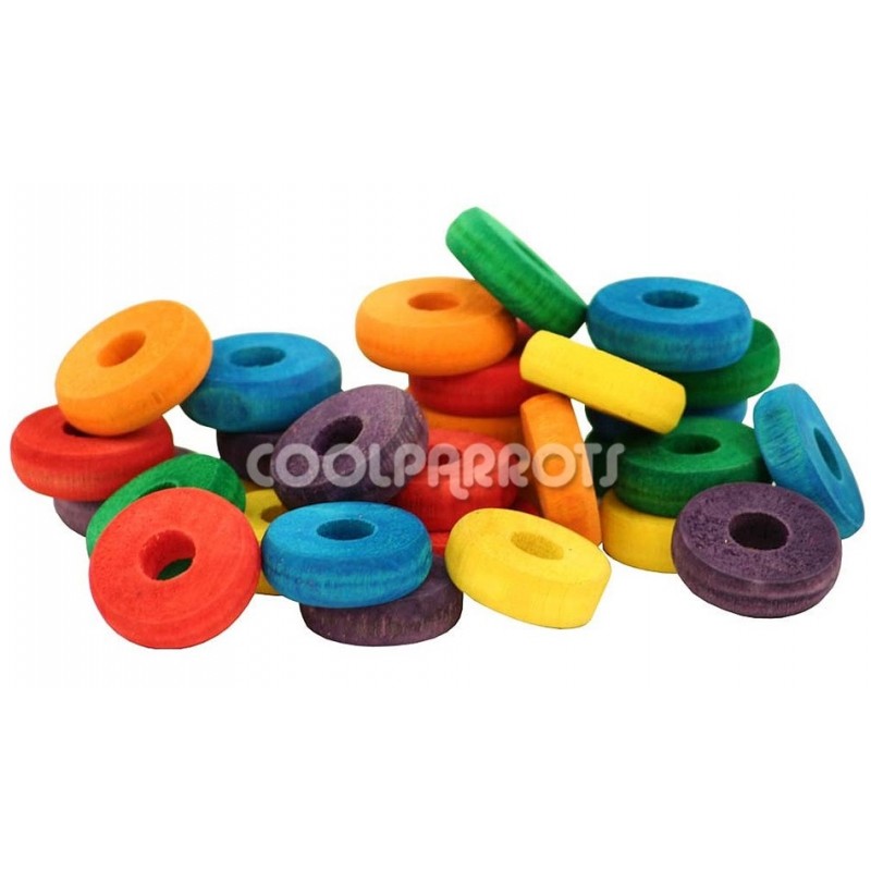 Disco de madera de llamativos colores con el que restaurar viejos juguetes de forma económica. Estos discos son adecuados para aves de tamaño pequeño y mediano como ninfas, pyrrhuras, caiques, nóbilis, yacos…