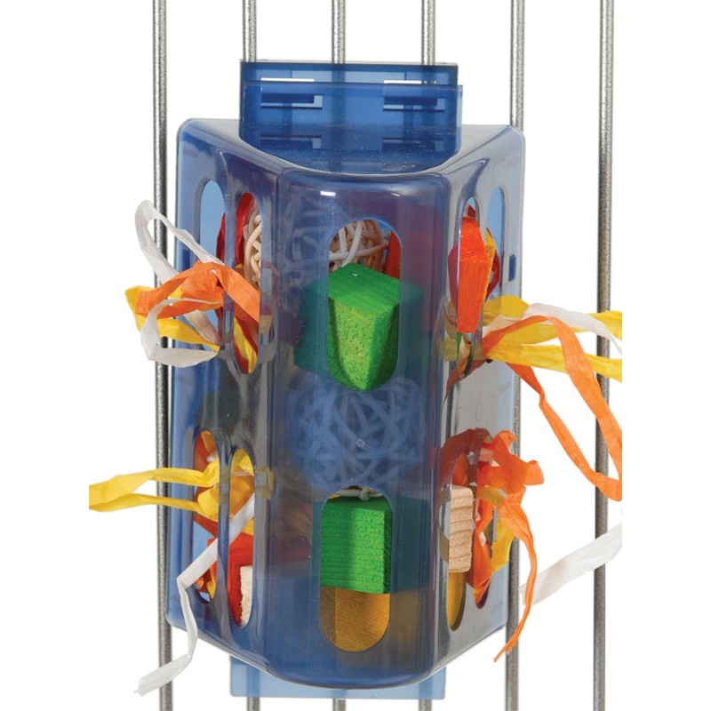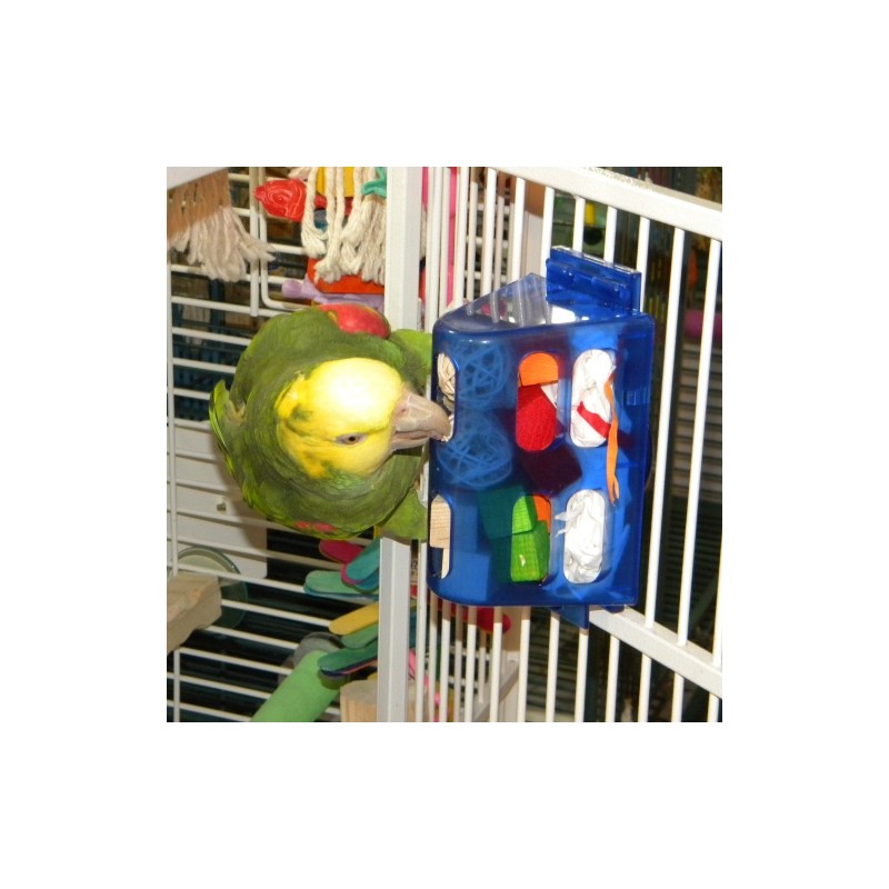 Entretenido juguete relleno de varias piezas de diferentes materiales, formas y colores. Nuestras aves deberán extraerlas por sus distintas ranuras para poder jugar con ellas.