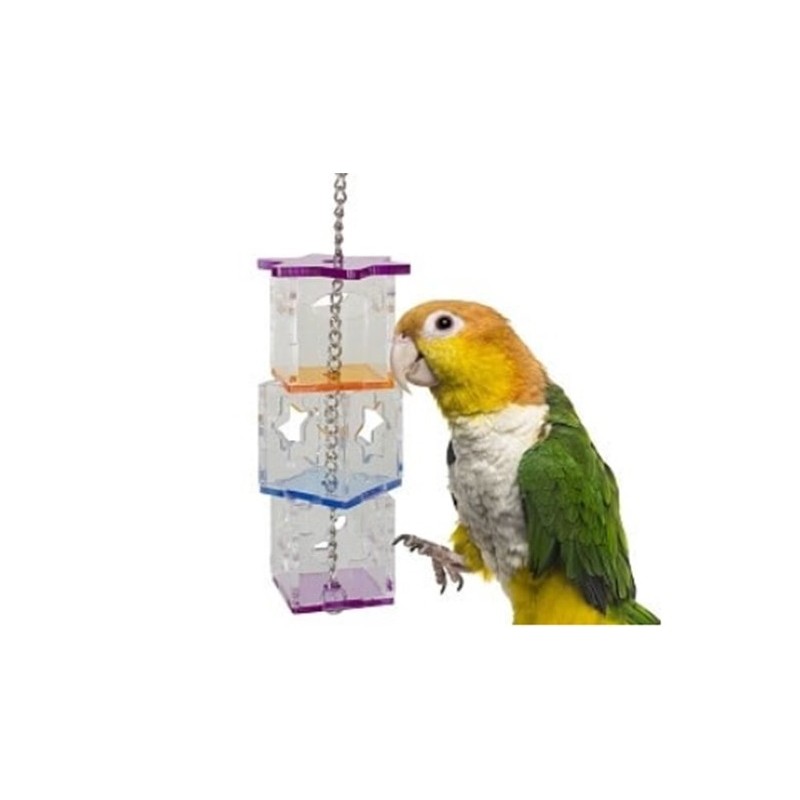 Este juguete acrílico está diseñado para facilitar el forrajeo ya que requiere que los pájaros trabajen para conseguir su alimento.