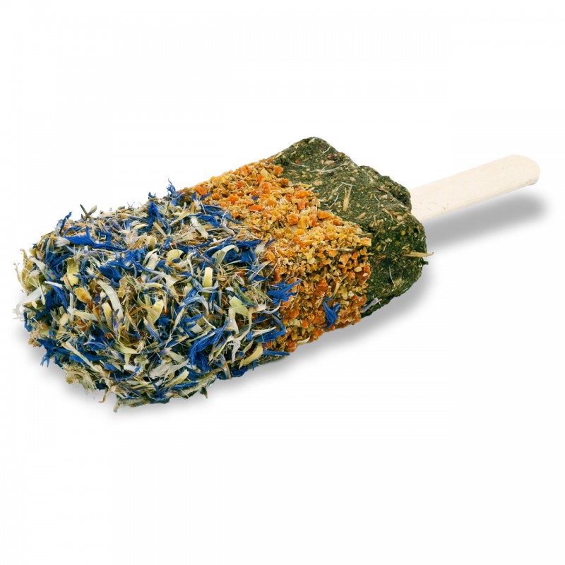 El alto contenido en fibra cruda de las hierbas tiene un efecto positivo sobre la digestión y, al mismo tiempo, favorece la importante abrasión de los dientes. El palo de madera natural también es ideal para roer y comer.