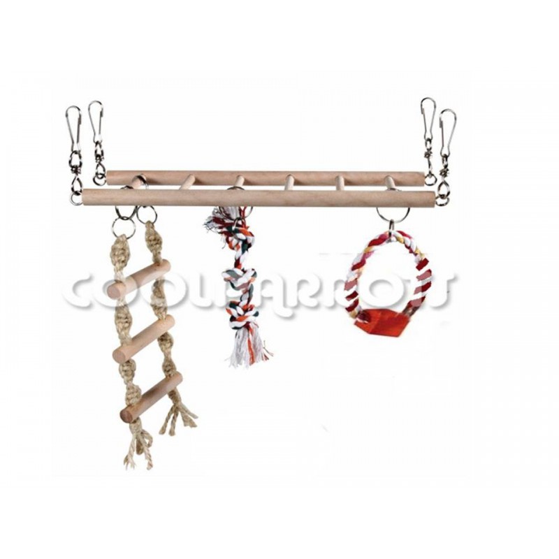 Divertida escalera de madera para poner en el techo de cualquier jaula de la que cuelga una escalera de cuerda, una cuerda de juego y un aro.