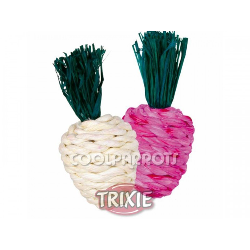 Pack de dos juguetes de cuerda y paja con forma de rabanitos de 6 cm de longitud.