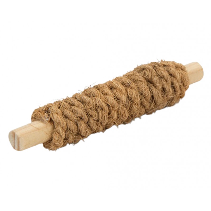 Un palo de madera envuelto en cuerda hecha 100% de coco natural, son suficientes para tener a nuestros conejos, roedores y aves entretenidos.