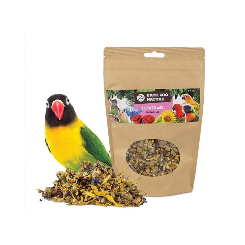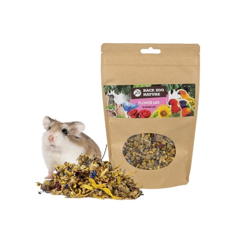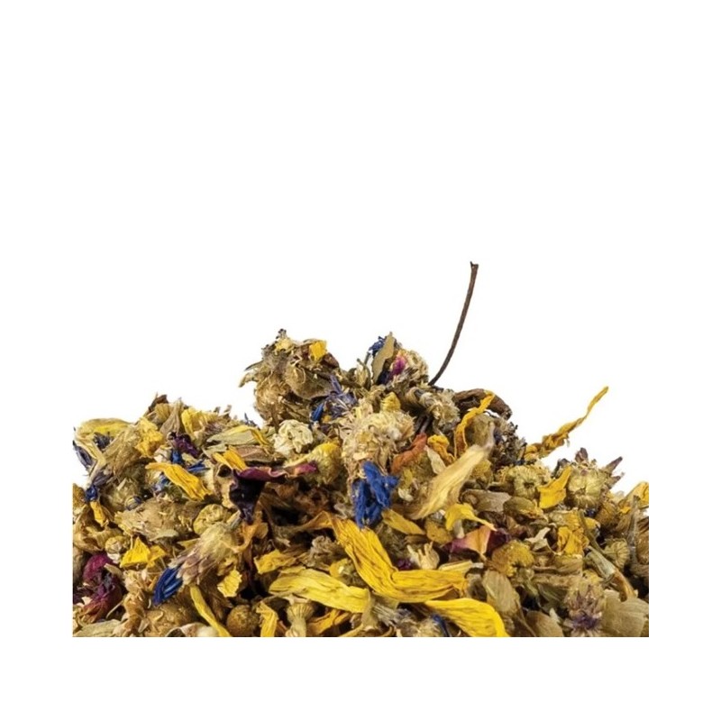 Esta mezcla 100% natural de cinco tipos de flores secas de gran calidad (manzanilla, aciano, girasol, rosa y lúpulo) es el complemento perfecto o un premio súper saludable para aves, conejos y roedores