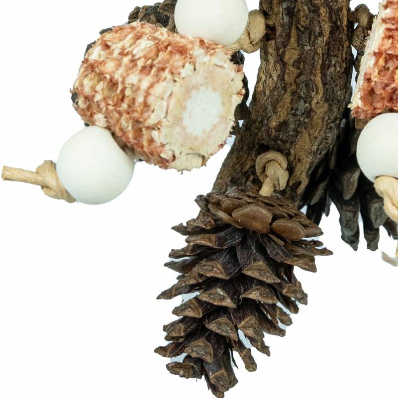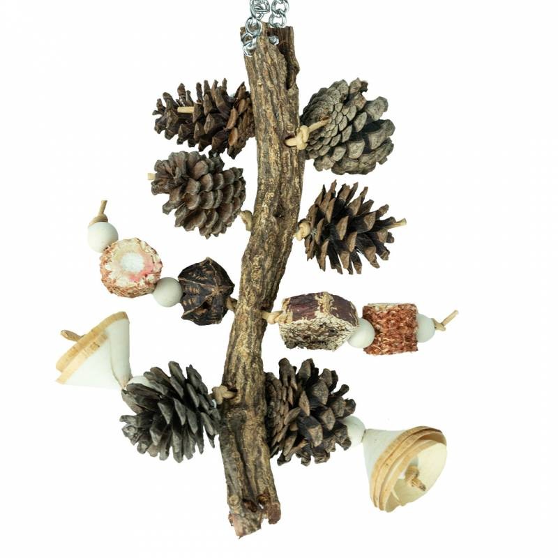 Pequeña rama colgante ideal para balancearse y triturar la gran cantidad de piezas naturales que lleva insertadas (piñas, mazorca, fruto de caoba y madera natural)