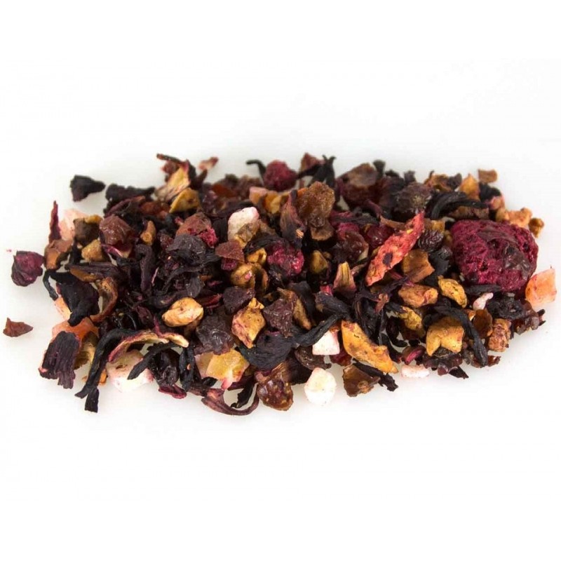 Esta mezcla contiene flores de hibisco, flores de manzano, flor de rosa mosqueta, fresa, papaya, plátano, cereza, frambuesa, uvas y bayas rojas deshidratadas.