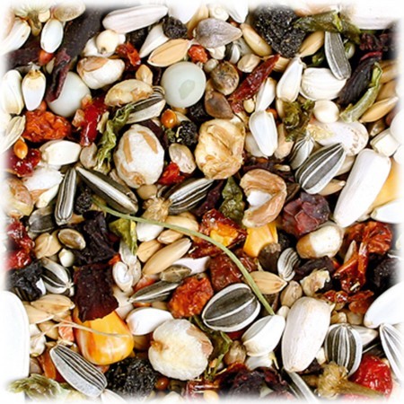 Composición: cardy, pipas de girasol rayadas, sorgo, mijo del maná, semilla de alpiste, zanahoria, alforfón, mijo amarillo, maÃz, trigo, milo, arroz con cáscara, semilla de cáñamo, avena deceorticada, frijoles mungo, pipas de girasol blancas, avena derby, guisantes, serbas, granos de sáuco, remolacha, bayas de aronia, tomates, escaramujo, conchas de ostra, pimiento rojo, camomila, trigo inflado, semillas de calabaza y calabacÃn, pimiento verde.