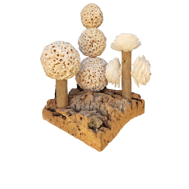 Varias piezas talladas en raíz de yuca, material 100% natural con el que se elabora la tapioca, posan sobre una base cuadrada de corcho que incluye dos palomillas para colocar en las esquinas de cualquier jaula o voladero.