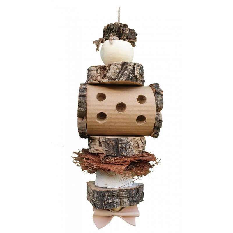Este divertido juguete de forrajeo está compuesto por un gran rollo de cartón, un bloque de calcio, varias ruedas de madera natural, un cuenco relleno de papelitos rizados, varias hojas de corteza de palmera y un gran lazo de cuero vegetal.