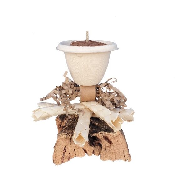Un gran bloque de corcho es la base de este juguete para loros de tamaño mediano, sobre esta encontramos varios sticks de rafia, un tubo de grueso cartón relleno de pequeñas tiras de papel rizado y un cuenco en el que podemos introducir cualquier tipo de alimento.