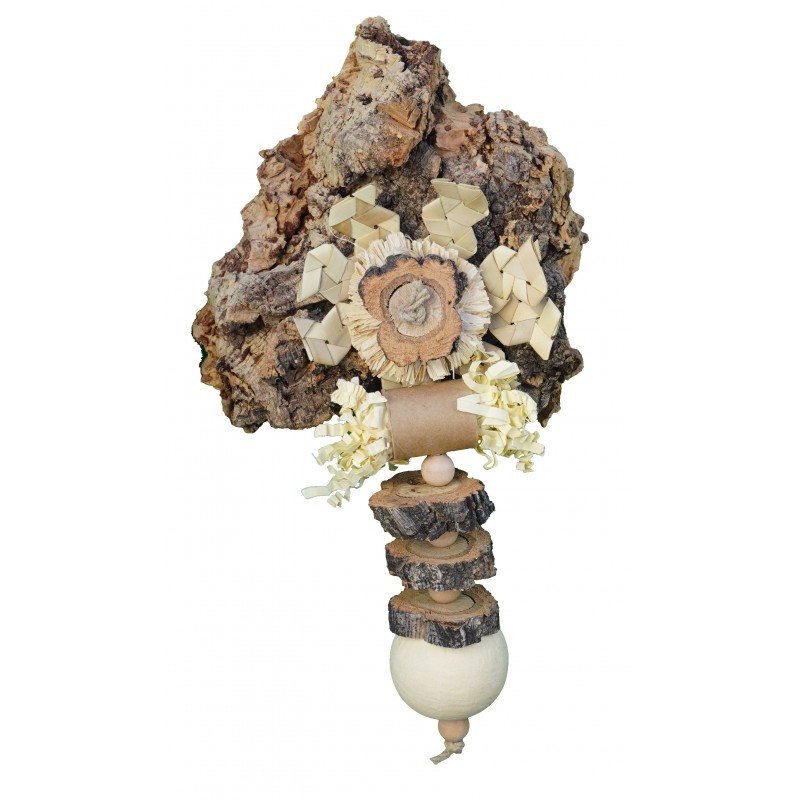 Este entretenido juguete está compuesto por una gruesa pieza de corcho natural con tornillo y palomilla para colgar de cualquier tipo de jaula o voladera.