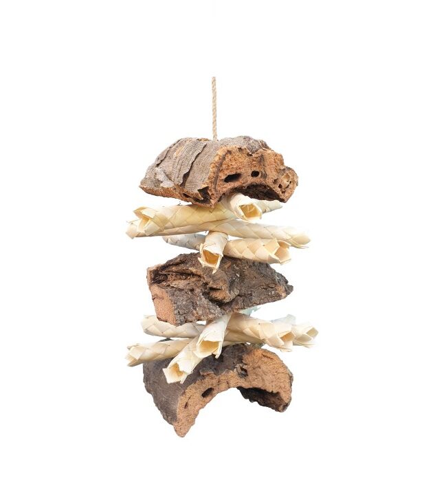 3 grandes piezas de corcho y varios sticks de ratán componen este entretenido juguete de forrajeo que cualquier loro adorará destrozar.