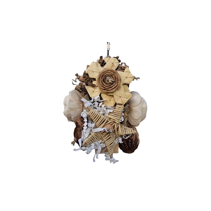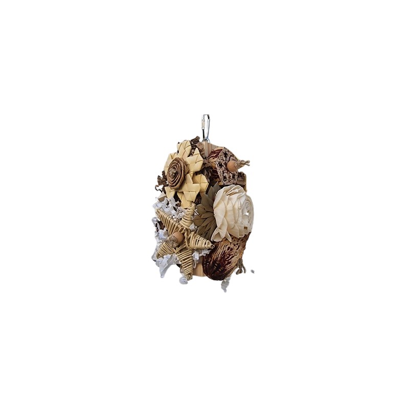 Ratán, hoja de palma, frutos de caoba, papel y madera son algunos de los materiales que componen este entretenido juguete para loros pequeños y medianos.