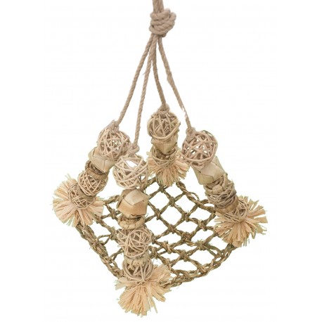 Divertido columpio para pequeñas aves tipo agapornis, periquitos o ninfas realizado con una base de esterilla que se sujeta a la jaula mediante cuerdas de cáñamo y que incluye diversos juguetes de ratán, hoja de palma y rafia 100% naturales para hacerlo todavía más llamativo y atractivo.