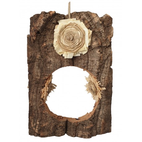 Un bloque de corcho 100% natural con un agujero central de 11,5 cm de diámetro forman este original columpio para loritos de pequeño tamaño como ninfas, agapornis, caiques..