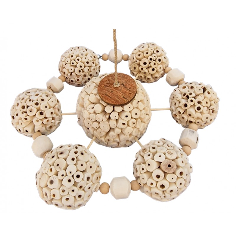Siete bolas talladas en raíz de yuca, material 100% natural con el que se elabora la tapioca, y varias piezas de madera y coco componen este divertido juguete para pequeños loritos.