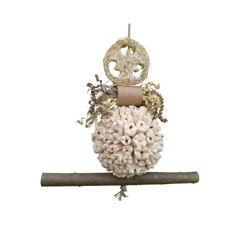 Divertido columpio para pequeñas aves realizado en madera, loofa, cartón.