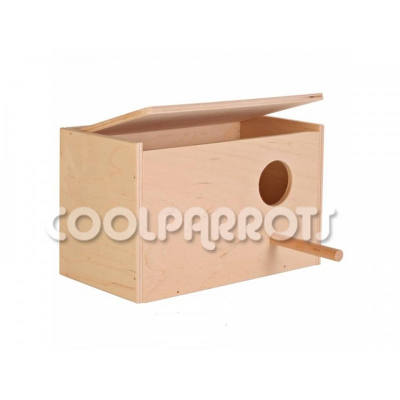 Nido de madera para cotorritas, ninfas, etc. Dispone de tapa abatible para facilitar su limpieza y de percha de aterrizaje.