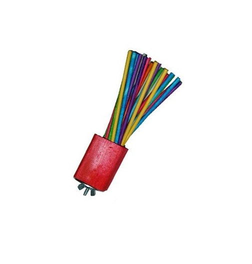 Divertido taco de madera de 5×3,5 cm relleno de multitud de palitos lollipop. Este juguete es ideal para loros de pequeño y mediano tamaño. Sus llamativos colores son un atractivo fundamental en cualquier juguete para loros, y los palitos de papel prensado son mucho más duraderos que algunas piezas de madera que rompen de un solo picotazo. Largo total: 15 cm.