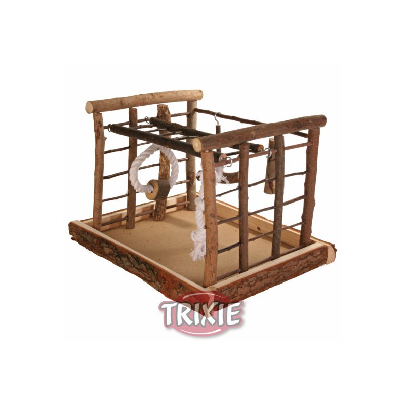 Divertido parque de juegos para pequeñas aves realizado en materiales naturales sin tratar. Está compuesto por escaleras, aro de algodón, cuerda para trepar, percha y juguetes de madera. Medidas: 35x29x25 cm.