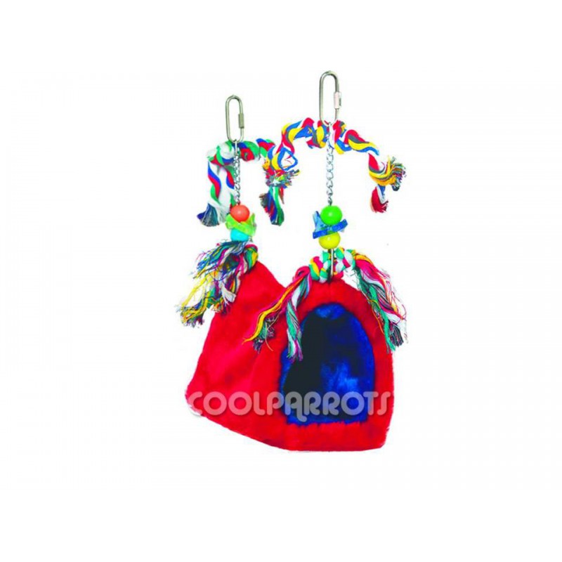 Divertido y acogedor refugio para loros con base rígida y diversos juguetes. Es el complemento ideal para cualquier tipo de jaula y ave, los aisla y protege de las bajas temperaturas y además les proporciona un lugar cómodo y divertido para jugar o descansar. Los colores pueden variar.