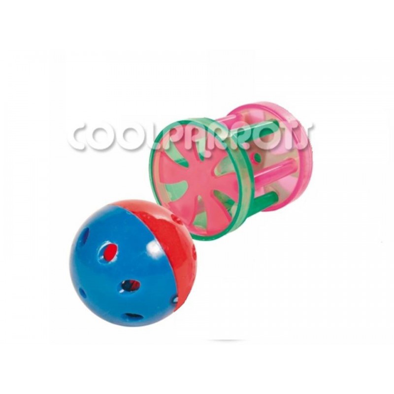 Pack que contiene dos divertidos sonajeros en forma de rulo y pelota. Estos dos juguetes acrílicos tienen un diámetro de 4,5 cm y son fantásticos y económicos juguetes de pata, pero también pueden utilizarse para colgar en nuestros juguetes caseros. Ambos llevan un cascabel en su interior, esto los hace muy atractivos para cualquier loro.