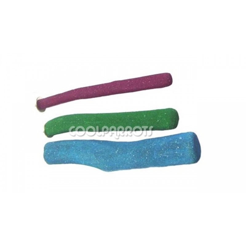 Elaboradas con interior de madera de manzanita (madera natural de gran dureza) y con un recubrimiento permanente de arena de vivos colores. Son ligeras y se adaptan a cualquier tipo de jaula. Su uso regular mantiene el crecimiento de uñas y pico en su justa medida. Le permitirá manejar su loro con comodidad sin que le clave las uñas en las manos.