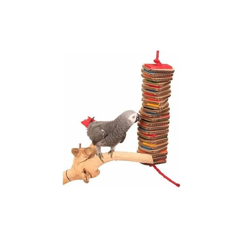 Horas de entretenimiento para todo tipo de loros con este divertido juguete realizado en cartón, madera y cuerda de sisal.