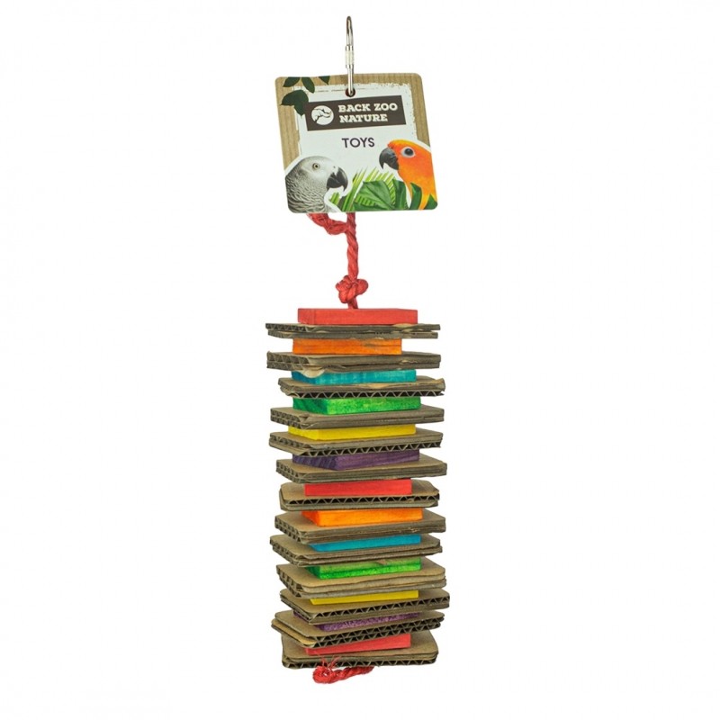 Horas de entretenimiento para todo tipo de loros con este divertido juguete realizado en cartón, madera y cuerda de sisal.