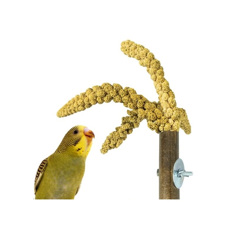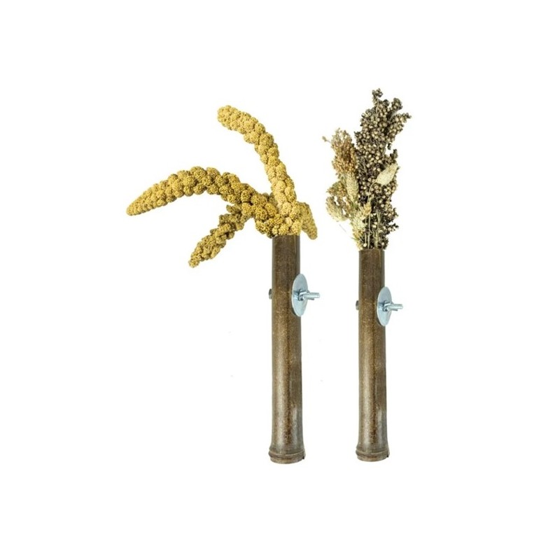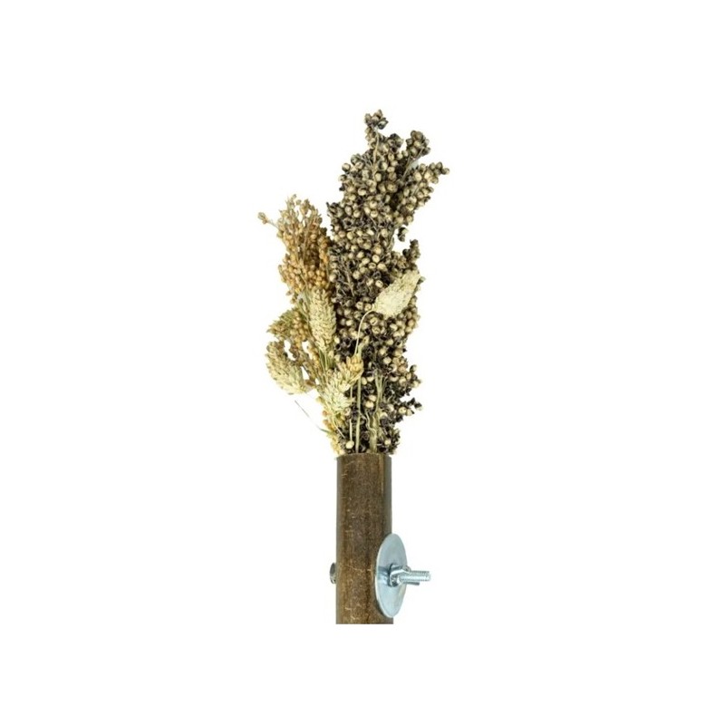 Una vara de bambú 100% natural es la base ideal para fijar ramilletes de hierbas o mijo en la jaula de nuestras aves, evitando así que se desperdicie cayendo al suelo o metiéndose entre las rejas.