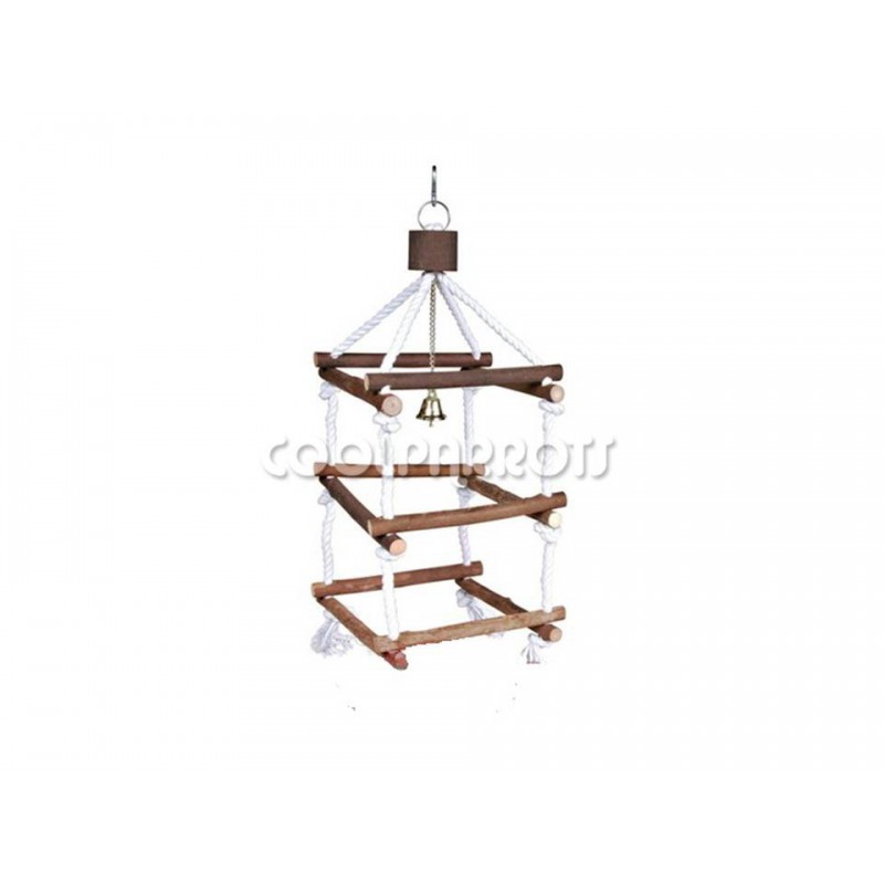 Divertida torre colgante realizada en materiales naturales sin tratar para colgar de cualquier jaula o voladera. Hace las veces de balancín y dispone de campana.